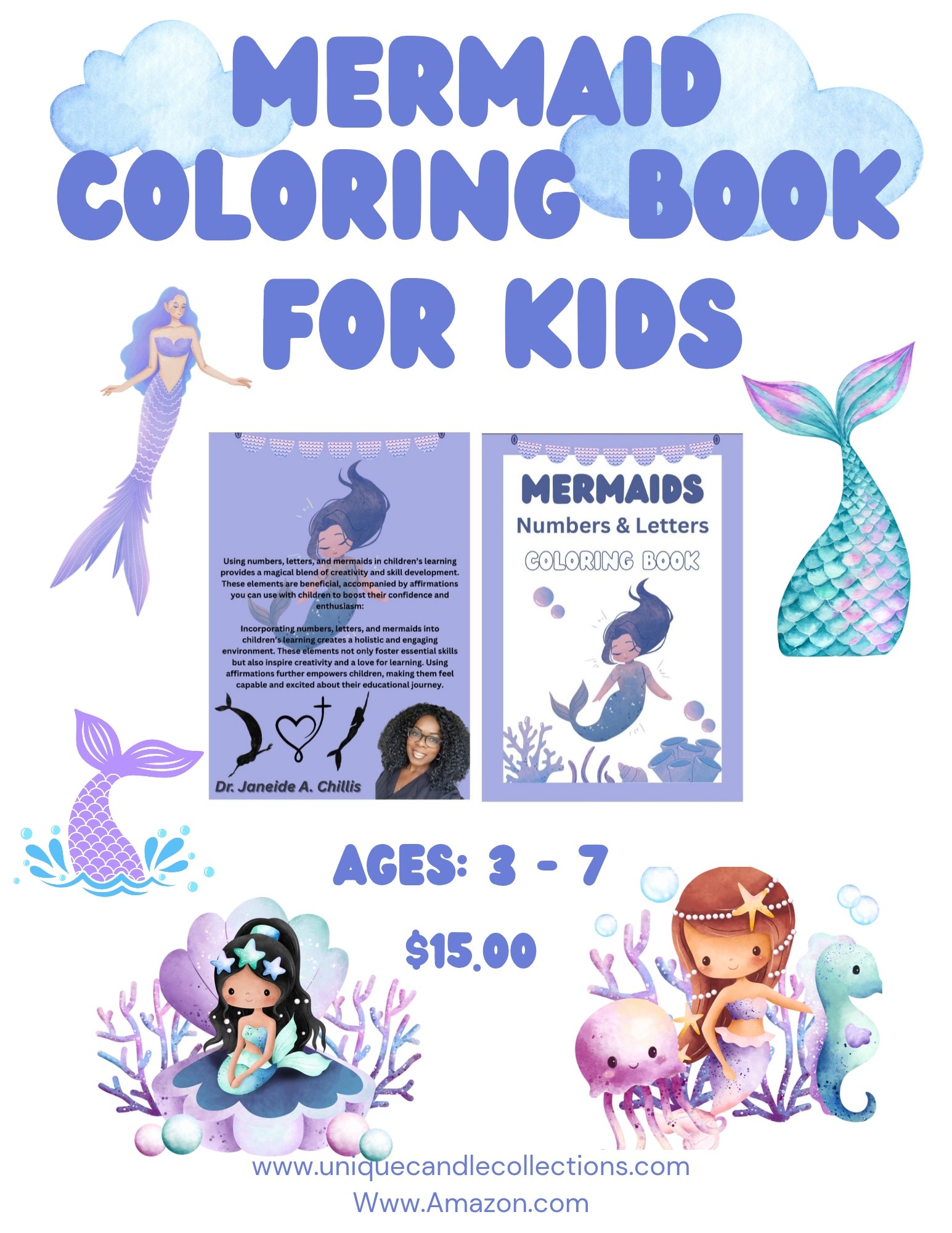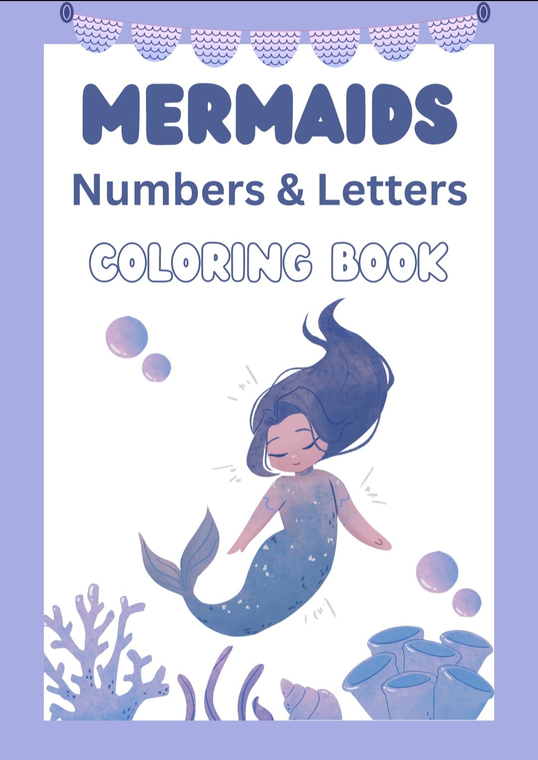 MERMAID children's Coloring Book with nunbers, letters, and affirmations